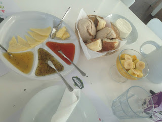 Além da simpatia do senhor que nos serviu, o pequeno almoço vem muito completo: queijo fresco, queijo normal, doces caseiros, pão, bolo lêvedo, salada de fruta, um iogurte líquido, um sumo e café com leite. Uma dose deu para mim e para ela. O único ponto negativo foi mesmo o café com leite que já vem feito tirando a hipótese de sermos nós a prepará-lo... Devia vir café e leite e a mistura deveria ser feita por nós...