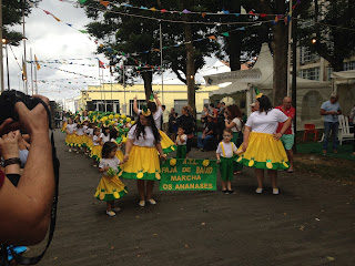 Fomos ao encontro da nossa marcha (Ponta Garça), que estava linda (para mim a mais linda da noite: nas roupas, música, dança e pendões! Tudo, simplesmente, perfeito!). Estavam a fazer o tal ensaio geral lá pertinho do hiper (sabem?! Aquele que vos falei que corre sempre mal?!) e, mal pus os olhinhos sobre eles, a minha veia de marchante começou a dar de si... A corrente sanguínea aqueceu e o meu desejo de ser uma daquelas meninas vestidas de garças, cheias de penas e de brilhantes e de tiara na cabeça, foi muito forte... Imaginar a minha M. vestidinha de garça em frente do pendão, junto dos outros meninos também palpitou no meu coração... Ela, ao ver o ensaio geral da marcha, começou a imitá-los, ponha as mãos na cintura e marchava, levantava as mãos quando eles também levantavam... Eu posso estar errada, mas a minha M. vai ser uma grande marchante! :)